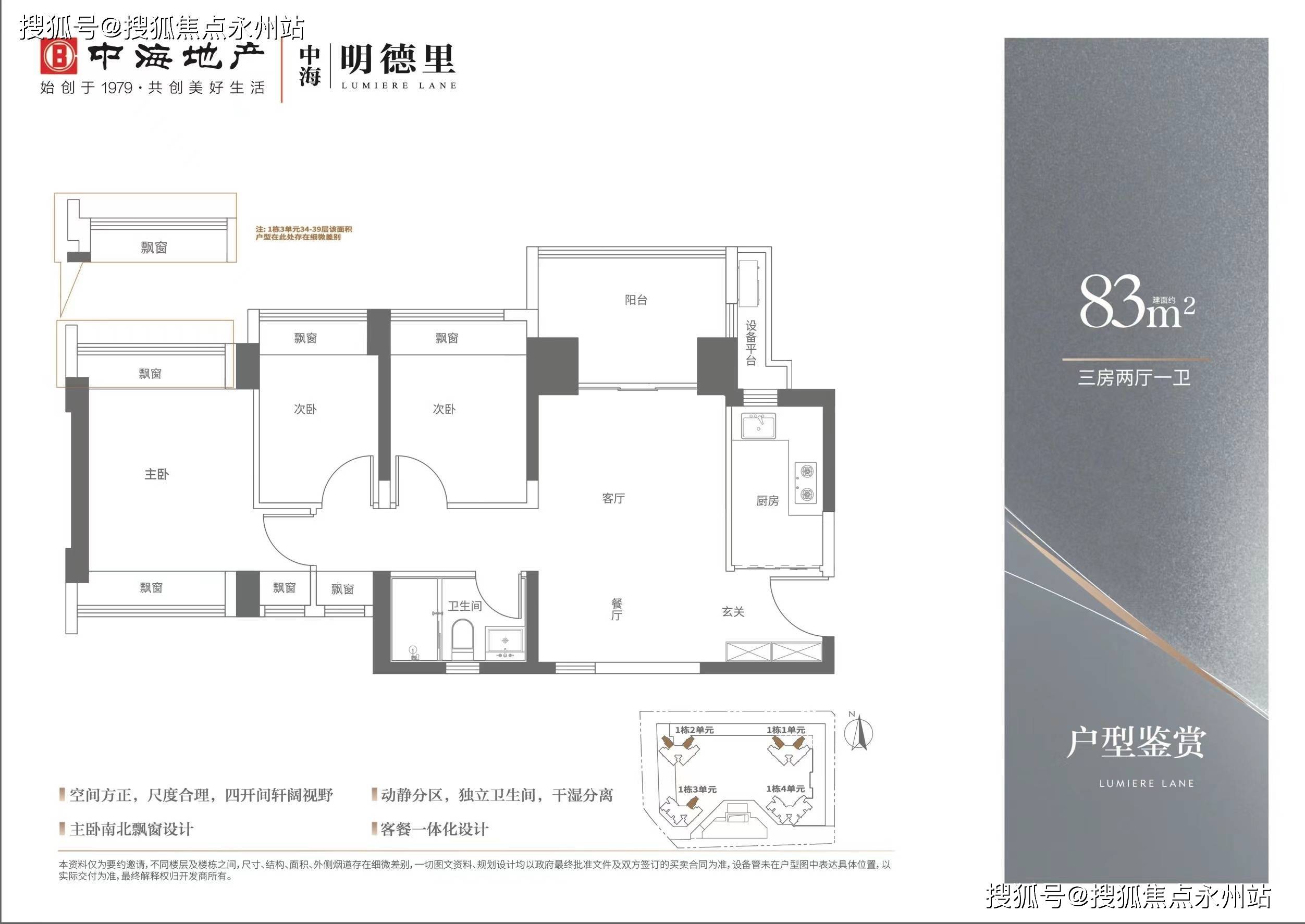 住宅房源建筑面积约为83-113㎡,提供3-4房的户型选择,均为精装交付。