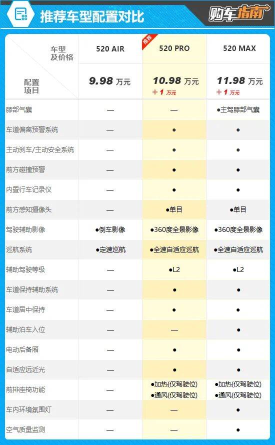 通过全系配置来看,520 PRO可谓高性价比之选,是本次重点推荐的车型。相比入门车型,推荐车型增加了前排座椅加热(驾驶位)/通风(驾驶位)、电动后备厢以及自适应远近光,舒适性和便利性均有所提升。同时,推荐车型还提供L2级辅助驾驶,涵盖车道保持辅助系统和车道居中保持功能,提升了驾驶体验;驾驶辅助影像也由倒车影像升级至360度全景影像。从售价来看,仅需增加1万元购车预算,绝对是物有所值。