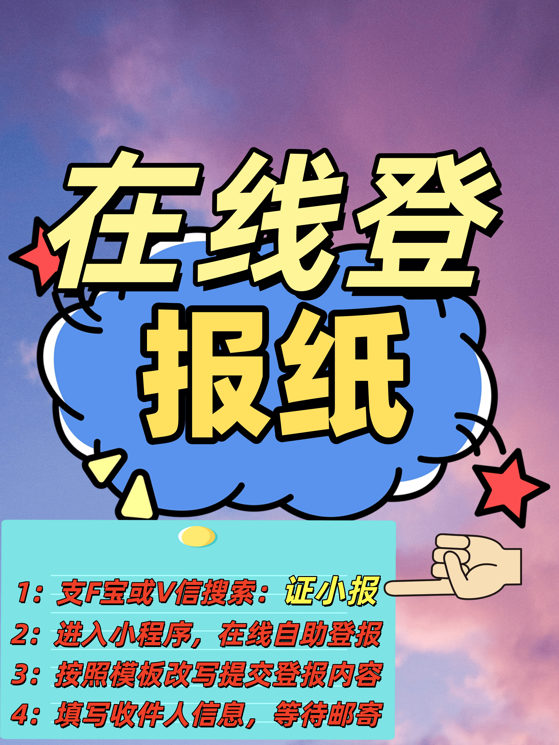 现在登报非常便捷,您可以直接通过支付宝或微信搜索【证小报】小程序自助办理。 这款工具与多家正规报纸合作,在线填写信息、选择报纸、支付费用后即可完成申请,报纸出版后还能邮寄到家,省时省力。