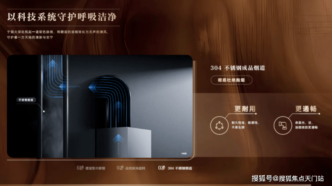 衡洁:清鲜如一的全域呼吸。摒弃传统水泥烟道,升级 304 不锈钢烟道系统,从结构上消除回烟与异味困扰;搭配多重滤网新风系统,PM2.5 过滤效率超 98%,让每一次呼吸都清新畅然。