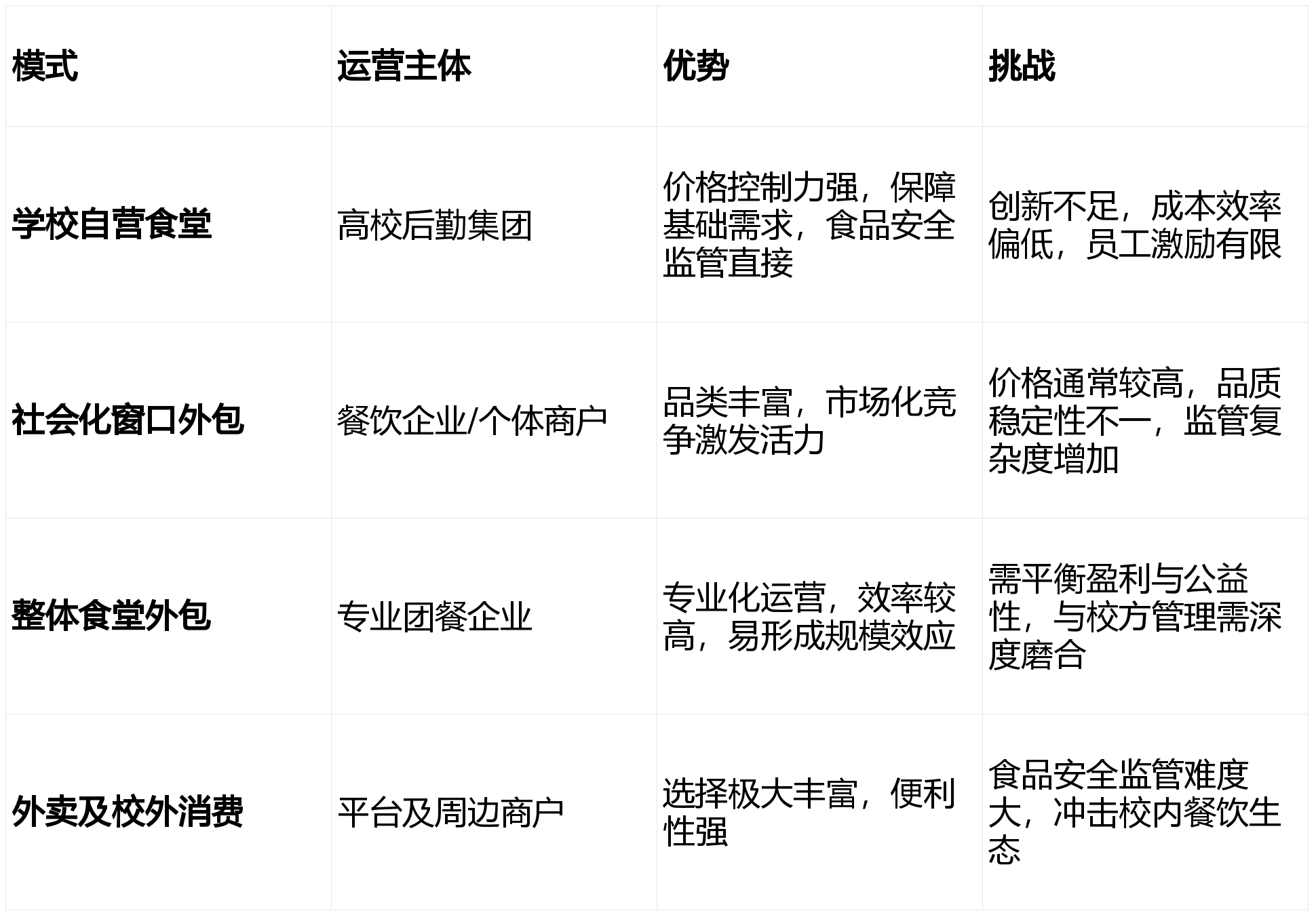 - 公益性定位与市场化运营的矛盾:高校餐饮始终面临“保价格、保安全”与“提品质、求利润”之间的张力。