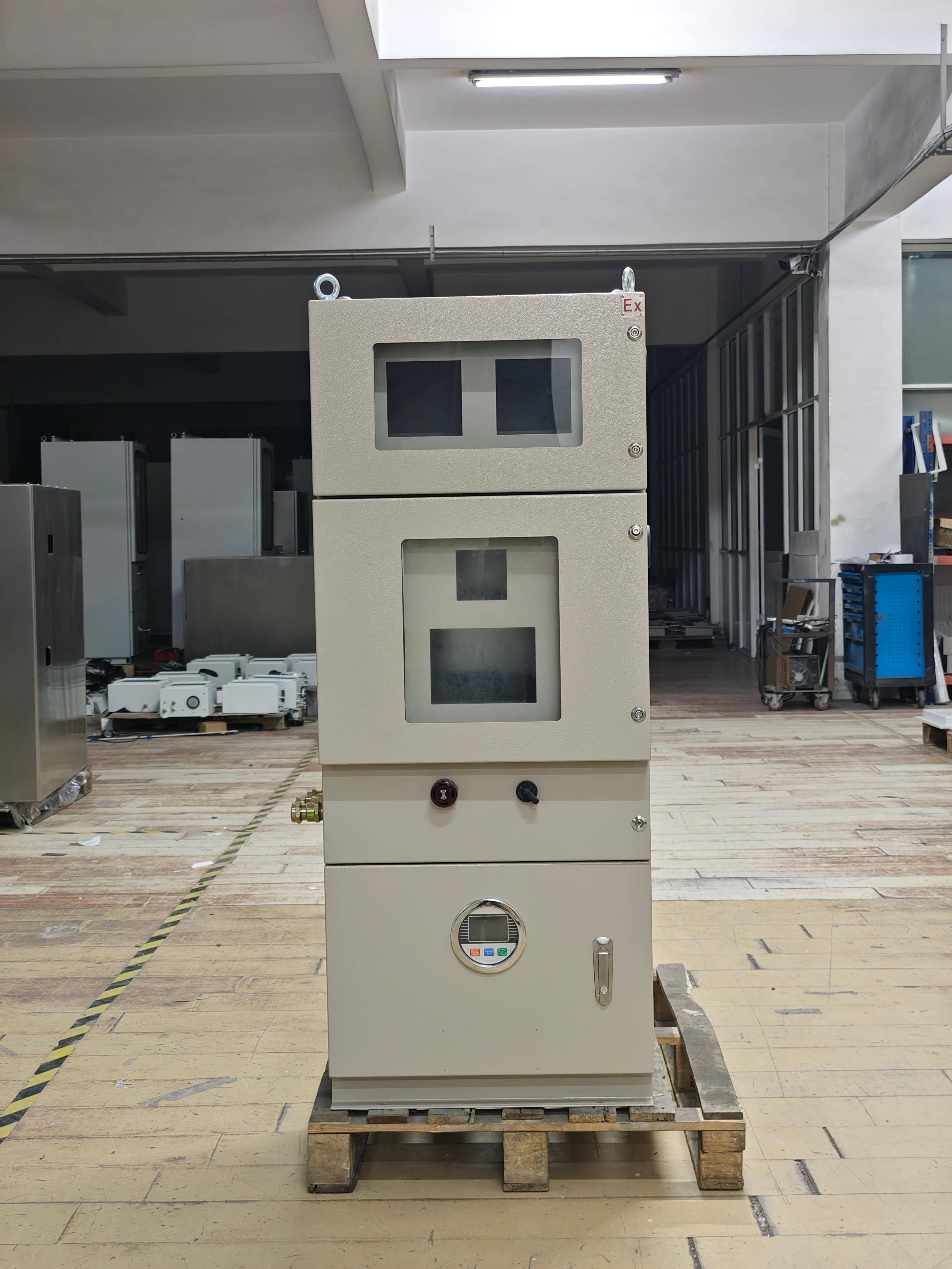 以南通金茂防爆电气有限公司的KTC系列智能正压防爆电气柜为例,其技术优势体现在三方面:1. 压力控制精度高:采用双传感器冗余设计,压力波动范围≤±5Pa,确保正压环境稳定;2. 智能换气逻辑:内置自适应算法,根据环境温度、湿度动态调整换气频率,能耗降低30%;3. 模块化设计:支持功能模块快速扩展,单柜可集成PLC、HMI、变频器等设备,减少现场安装工时40%。
