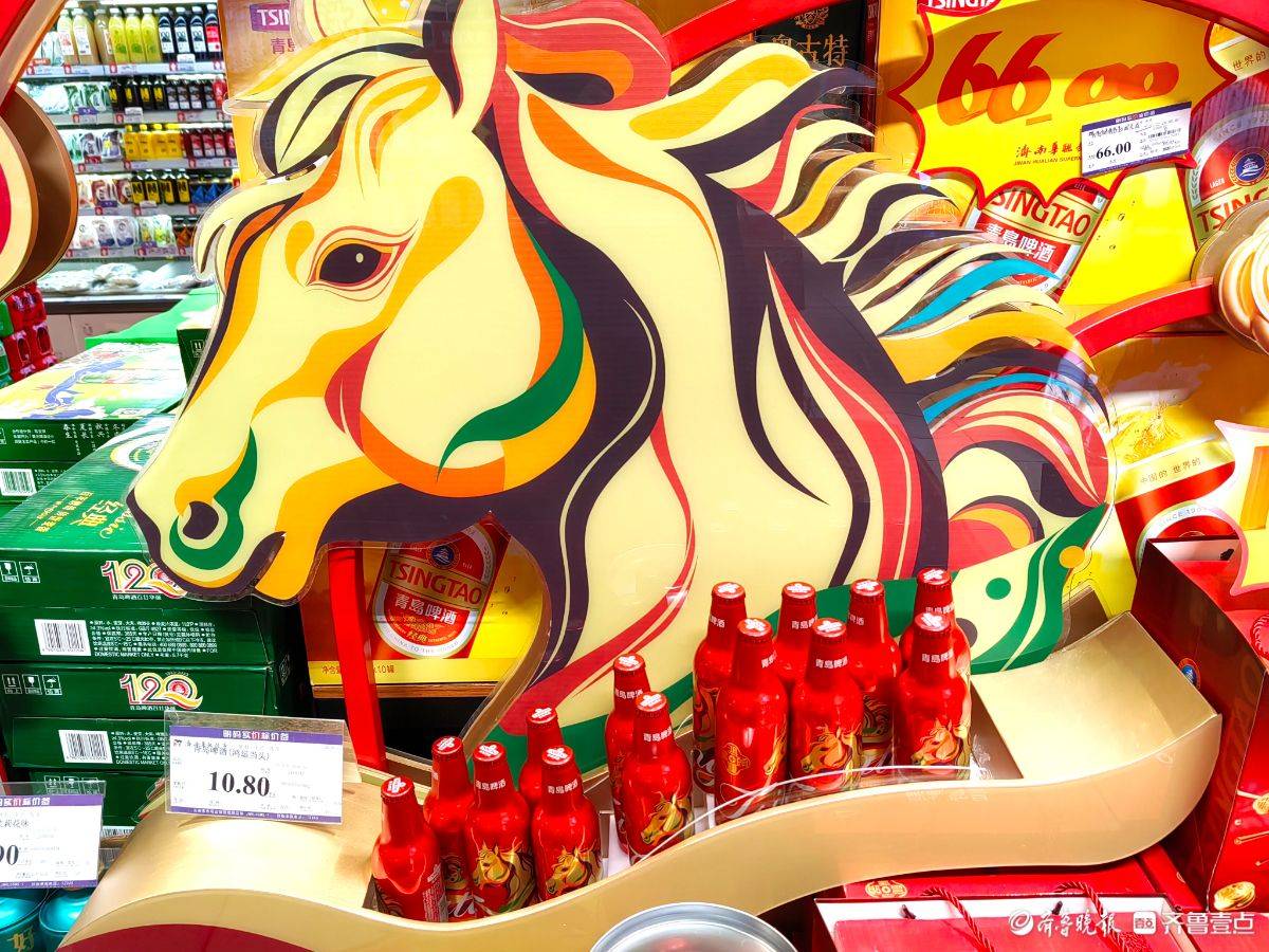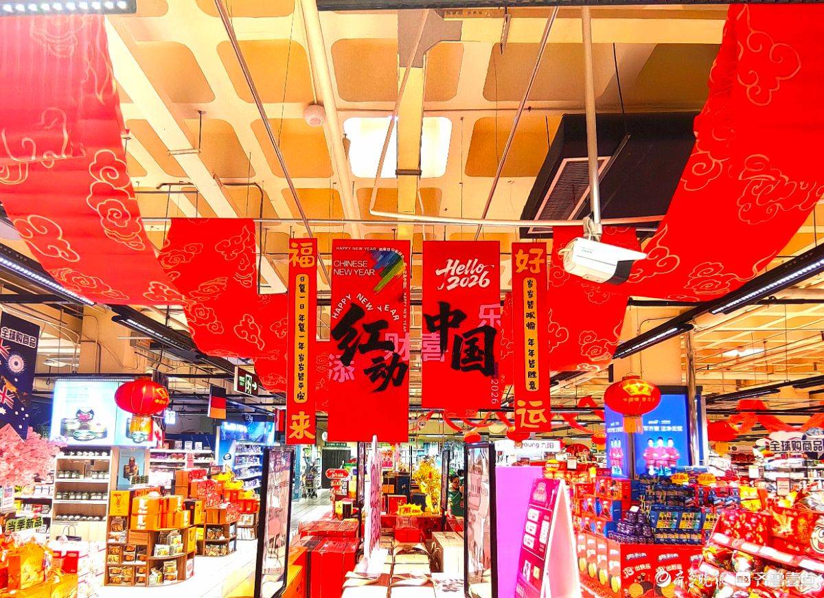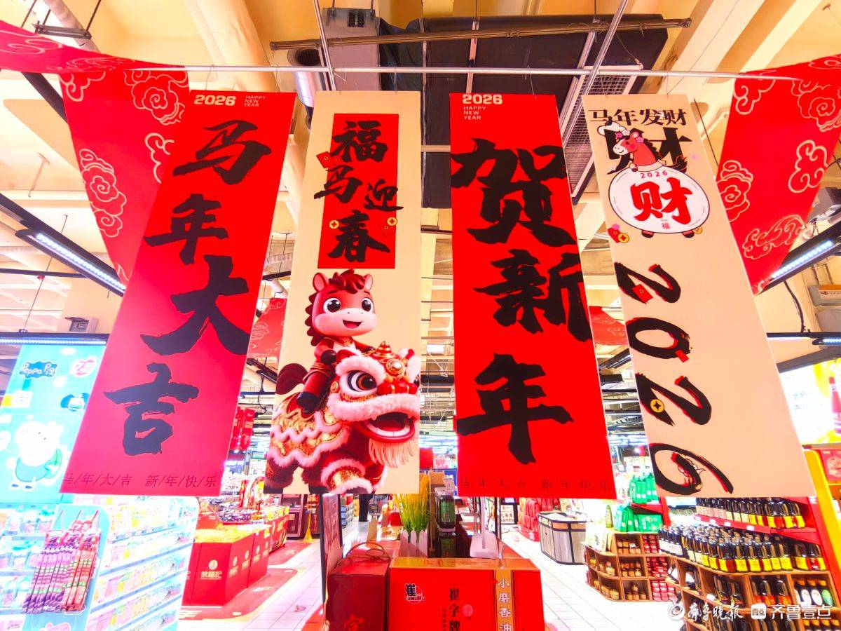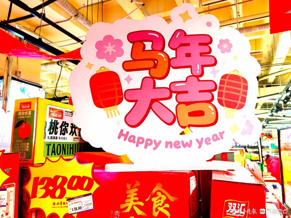 走进超市,满眼都是喜庆的红。“马年大吉”“贺新年”的条幅悬在头顶,卡通小马玩偶在货架旁俏皮招手。红彤彤的鱼形年糕码得整齐,彩椒在生鲜区泛着鲜亮光泽,啤酒的红瓶衬着骏马装饰更添年味儿。往来的人们推着小车,把糖果礼盒酒水一一放进购物篮,在这热闹红火的氛围里,把马年的福气和热闹,都带回了家。 王平 摄