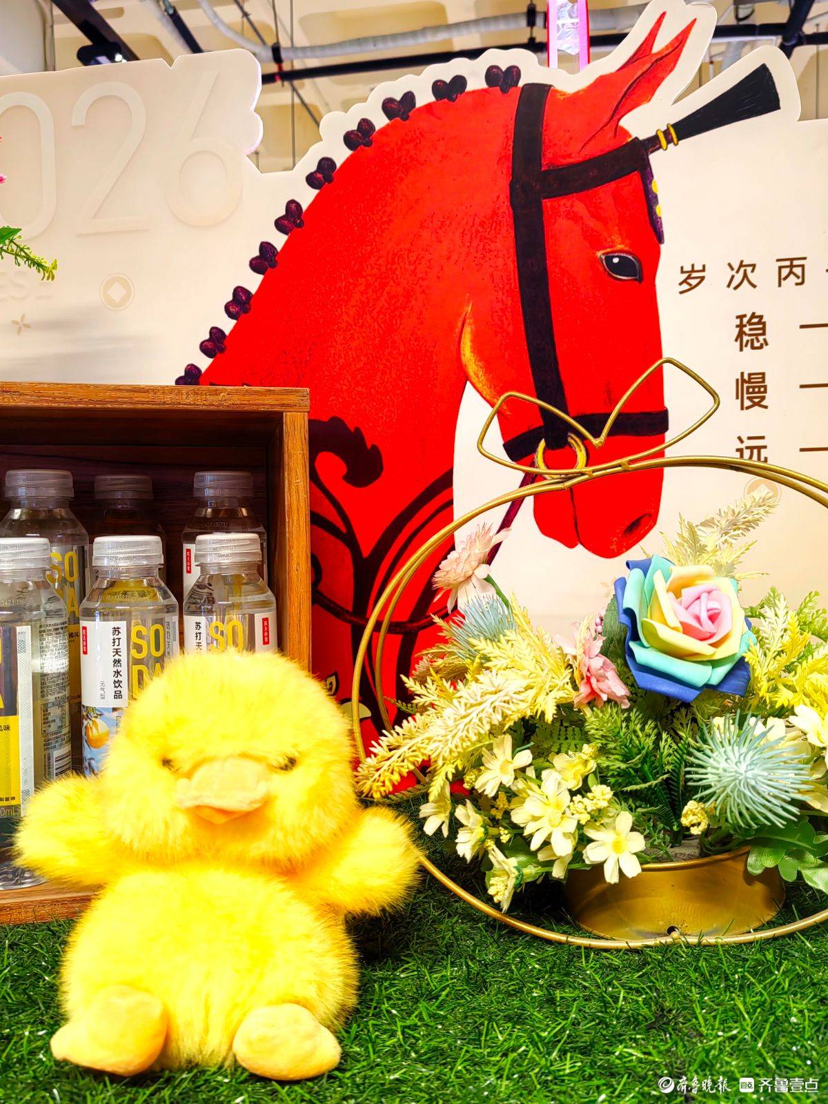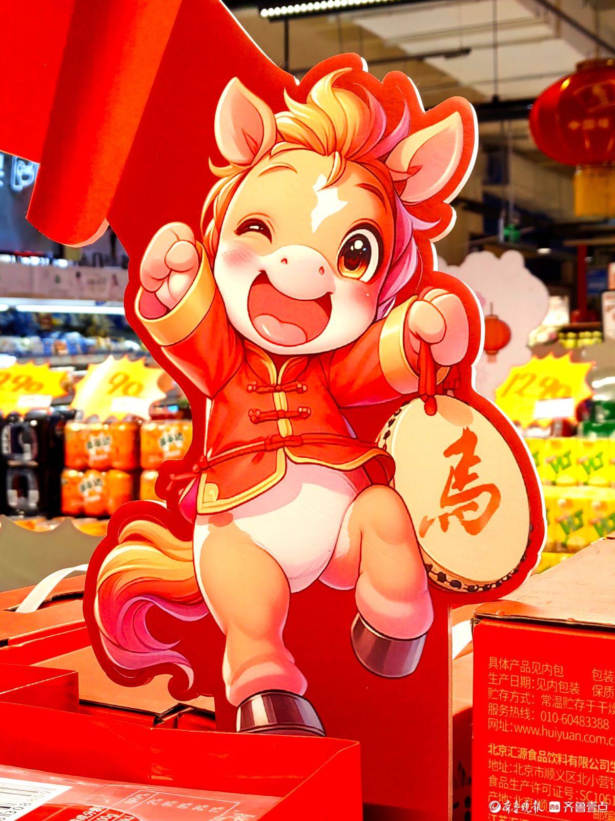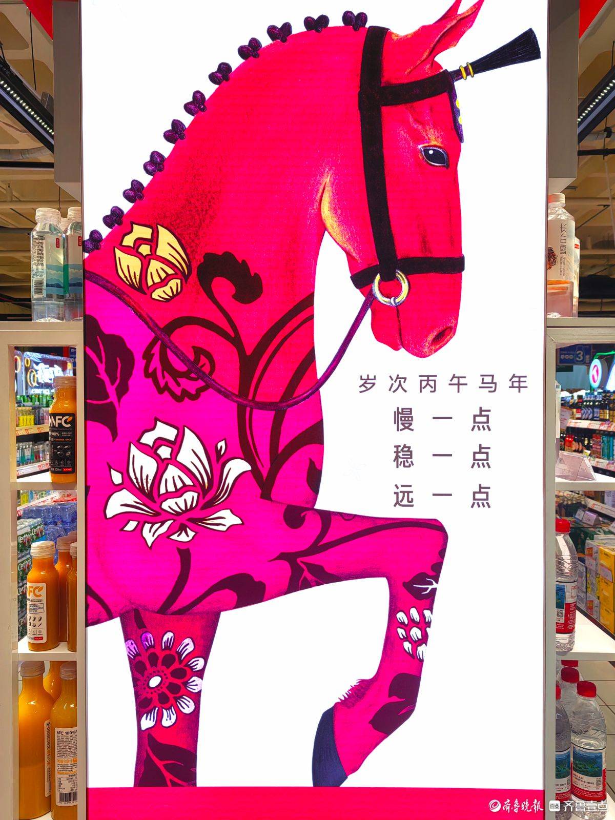 走进超市,满眼都是喜庆的红。“马年大吉”“贺新年”的条幅悬在头顶,卡通小马玩偶在货架旁俏皮招手。红彤彤的鱼形年糕码得整齐,彩椒在生鲜区泛着鲜亮光泽,啤酒的红瓶衬着骏马装饰更添年味儿。往来的人们推着小车,把糖果礼盒酒水一一放进购物篮,在这热闹红火的氛围里,把马年的福气和热闹,都带回了家。 王平 摄