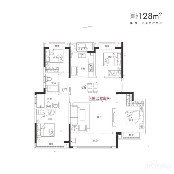 洋房128m²:同样是四室两厅两卫,赠送面积中包括飘窗。采用经典的四叶草一体式全面厅布局,户型更方正,家庭成员可以享有相对独立的空间,减少相互生活干扰。如果你喜欢明亮的空间和舒适的居住环境,这个户型可能会符合你的需求。