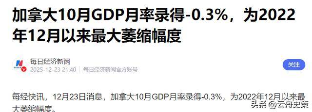 2025年底,加拿大GDP出现明显下滑,尤其是在上年10月,加拿大萎缩0.3%,创下三年来最大跌幅。