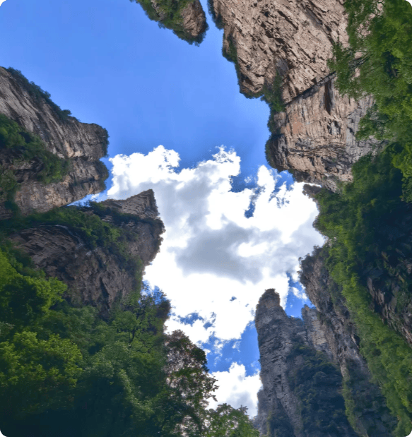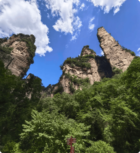 第3天:金鞭溪→天门山。早上出发去金鞭溪,这里是天然氧吧,溪水清澈、奇峰倒映,偶尔有野生猕猴出没,小纤提醒我们文明观猴、切勿投喂。我们走了1.5小时精华路段,打卡“千里相会”“金鞭岩”,漫步溪边缓解前一天爬山的疲惫。中午饭后前往天门山,小纤提前订好A线门票(索道上山+环保车下山),含玻璃栈道鞋套费,比官网便宜且不用排队。7455米高山索道十分震撼,脚下峰林云海交织,宛若置身云端。登顶后走玻璃栈道(5元鞋套费自理),惊险刺激值得体验,随后打卡天门洞,挑战一段999级天梯,登顶成就感十足。傍晚下山返回市区民宿休息。