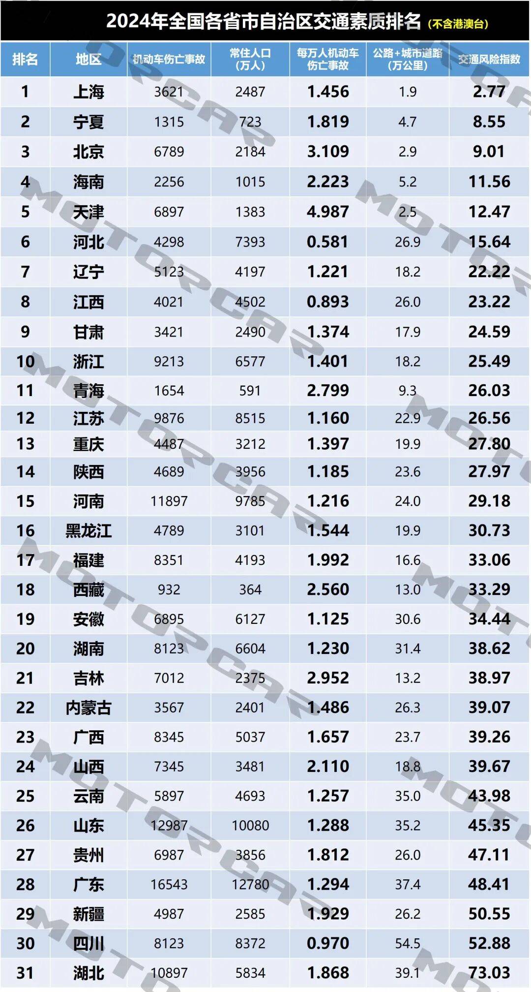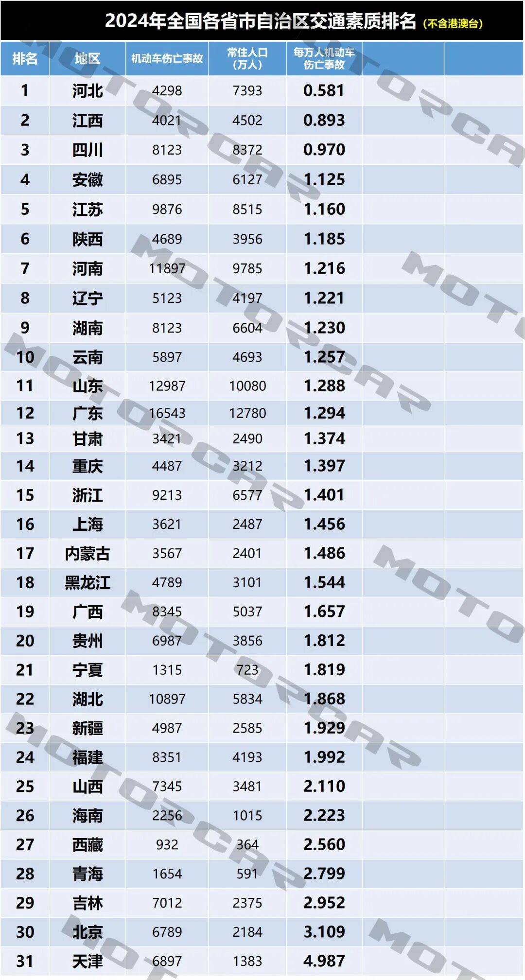 所以,相对来说科学一点的办法,就是用机动车伤亡事故量,除以常住人口。有些小伙伴或许认为除以各省司机数量会更科学。其实波哥不这么看,单单在上海,单单在北京,你看看有多少持外地驾照的司机在开车?而且本次统计的是各省、直辖市、自治区的交通素质,这是一个整体表现,而不单单只是评价司机素质。有些行人乱穿马路,骑着电瓶车横冲直撞,这也是引发交通事故的因素,所以行人以及骑手因素也是涵盖在交通素质当中的。