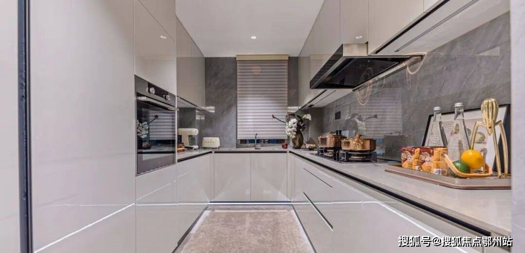 而且,为了保持厨房的整体美观,在安装时还采用了全嵌入式隐藏设计来安置冰箱和洗碗机,在柜体上还细心安装了吊柜感应灯与踢脚线灯。