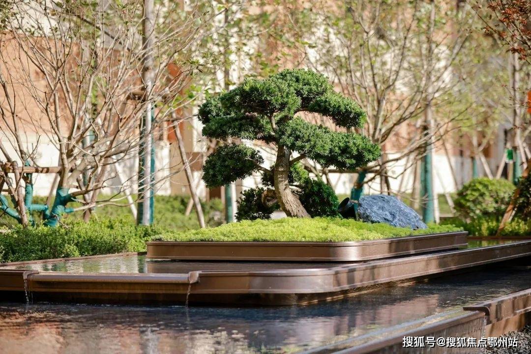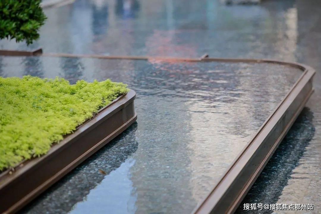 月光庭、浮光庭叠水潺潺,乔木掩映,层次感突出,营造出则繁华、入则静谧的度假式生活。