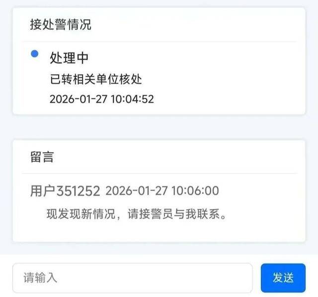 报警人可在“我的报警”里查询本人报警记录,对接处警状态进行跟踪了解,并根据处置进展情况与接警人员留言交互。