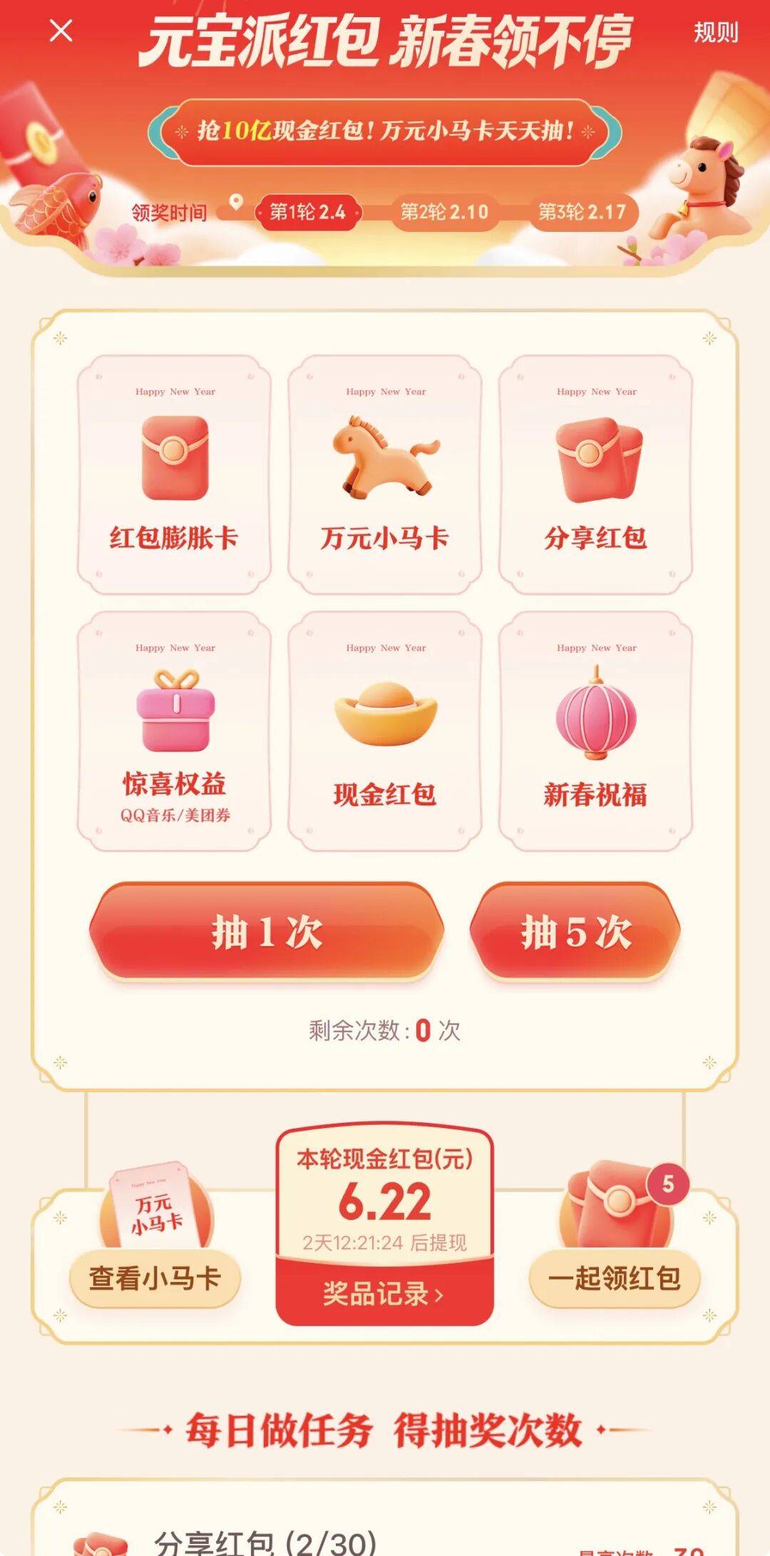 据了解,元宝主会场活动分为3轮,用户可在2月4日零点、2月10日零点、2月17日零点后开启上一轮的红包现金提现。