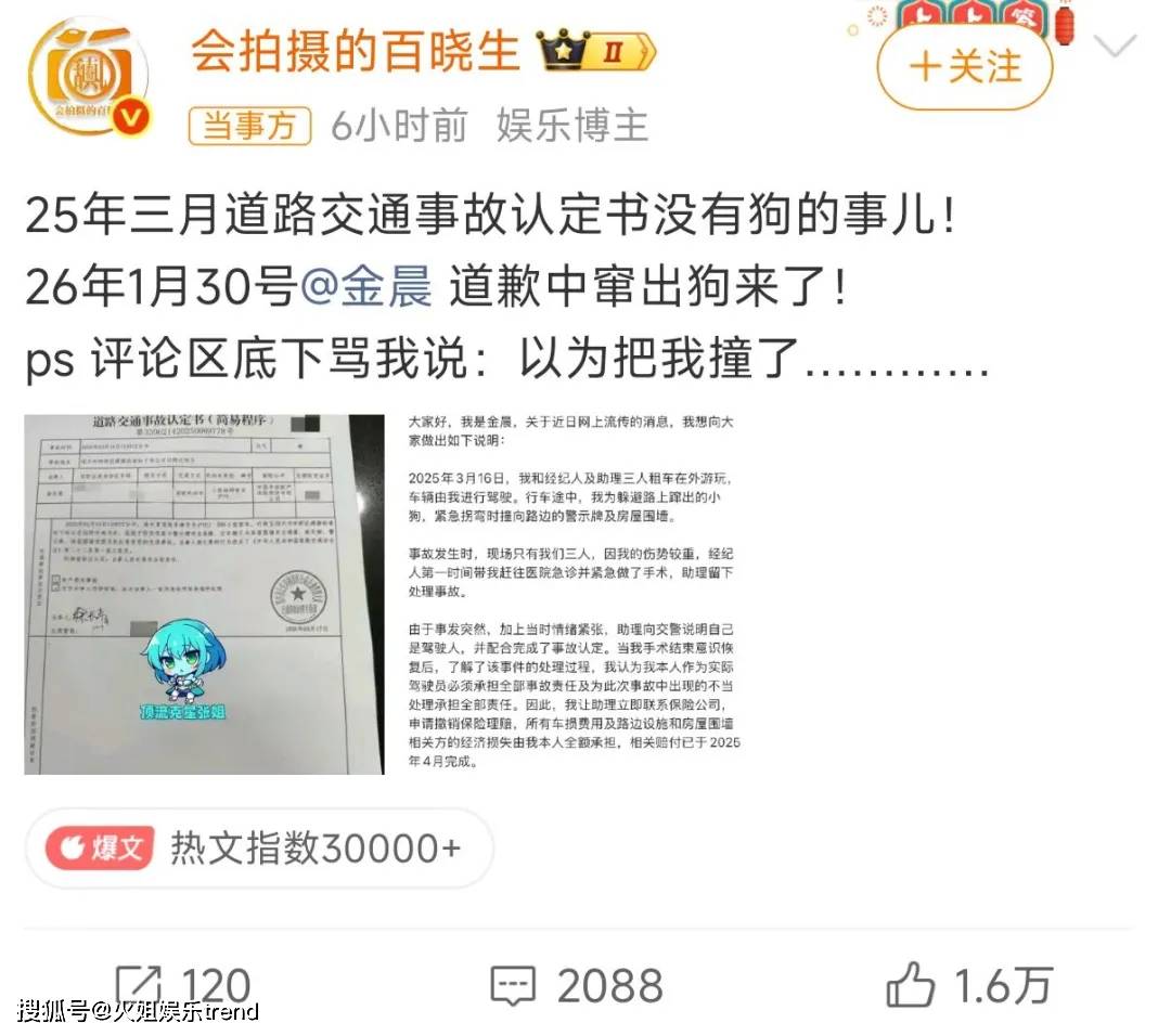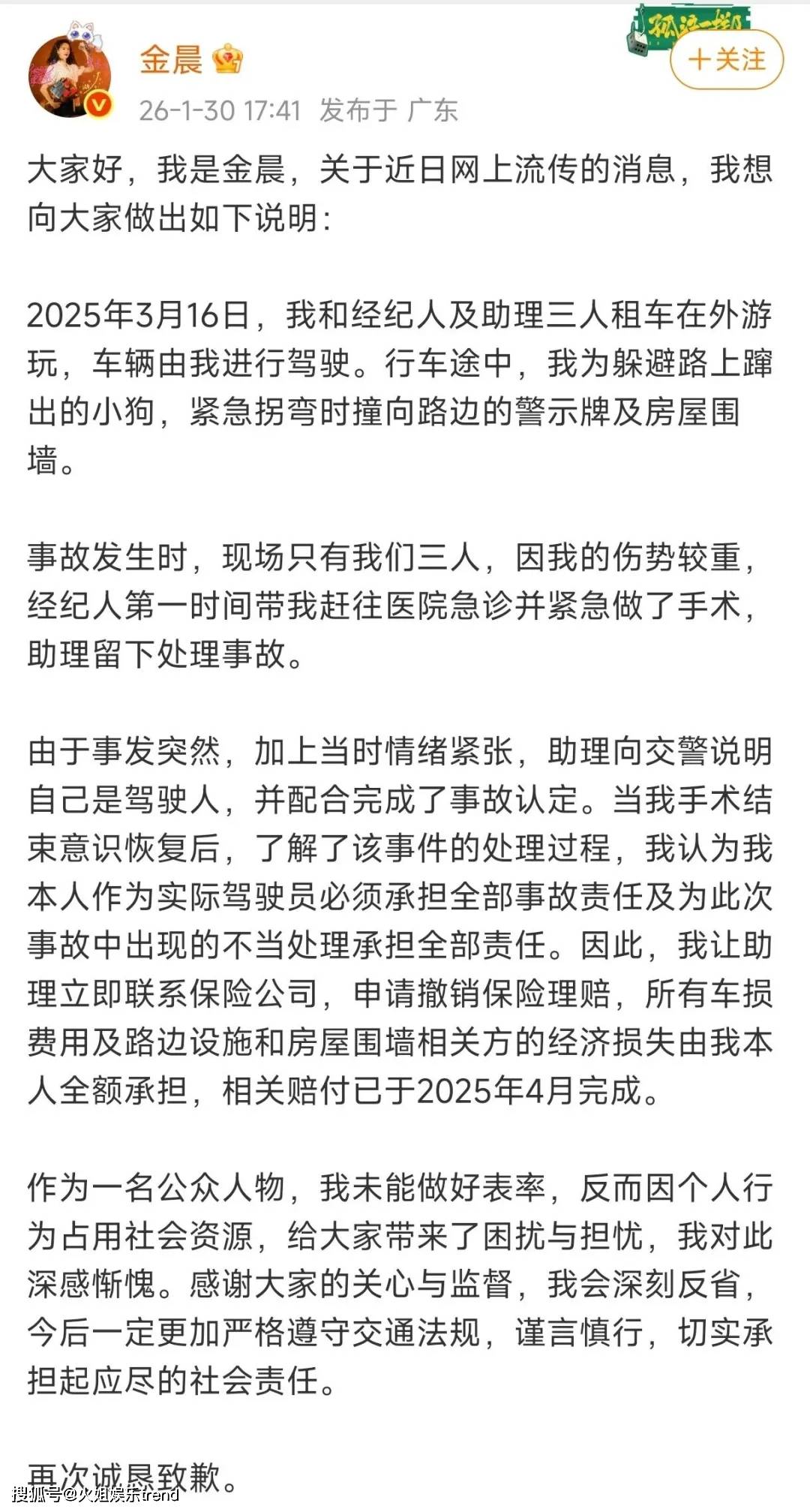 金晨发文致歉,官方结论:无逃逸、无酒驾毒驾、无骗保。