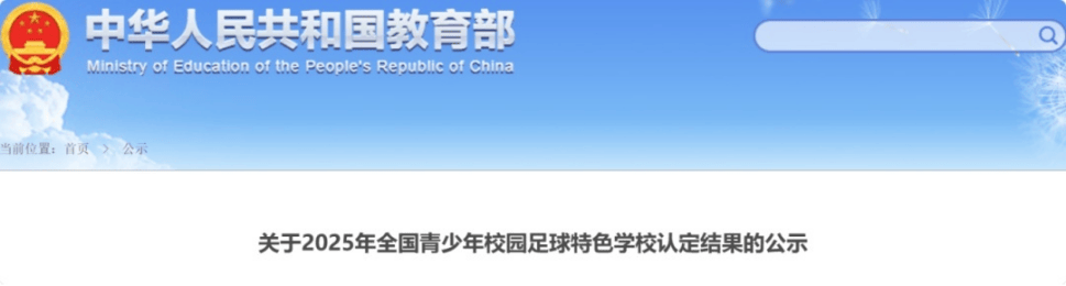 近日,教育部办公厅公示2025年全国青少年校园足球特色学校认定名单。经有关学校自主申报、专家评审、省级教育行政部门审核推荐、社会公示、专家复核等程序,拟认定2025年全国青少年校园足球特色学校4928所。现予以公示,公示期为2026年1月27日至2026年2月2日。