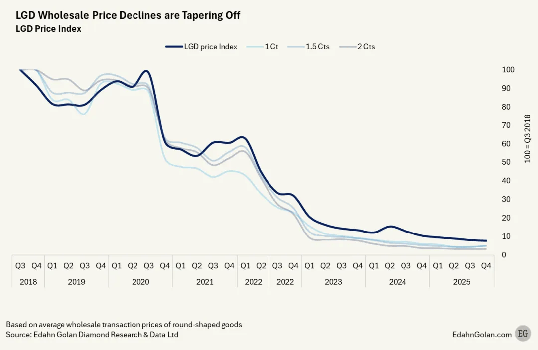 钻石行业分析师Edahn Golan最新发布的《实验室培育钻石批发价格表》(Lab Diamond Wholesale Price List)显示,2025年,全球培育钻石批发价比上年平均下跌了26%。报告指出,2025年,培育钻石批发价开始出现转向,这或许将成为该品类的重要转折点。尽管长期下行趋势仍在延续,但跌幅已显著放缓——第四季度批发价较第三季度的跌幅为4.7%,为培育钻石入市以来最小单季度跌幅。