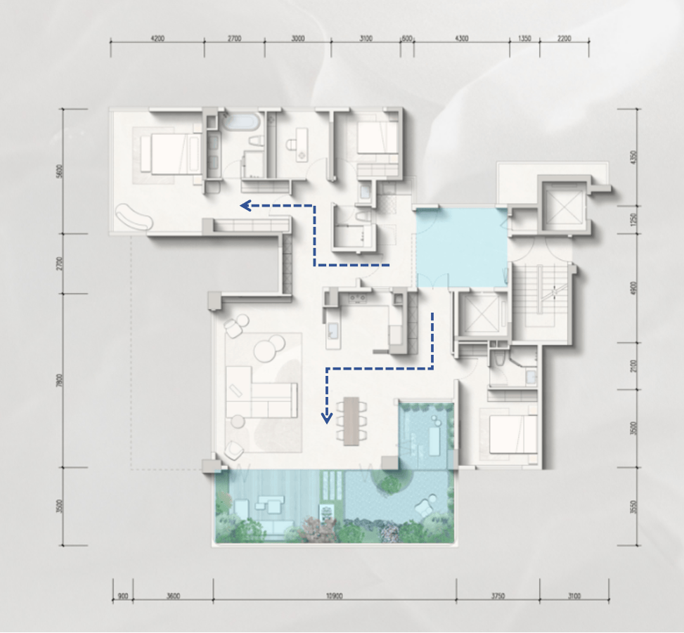 值得一提的是,中铁·卓萃在这里做了一个相当特别的设计:空中逃生平台。该平台联动消防系统,在紧急情况下便会开启,直接通向下一层,为业主提供一个安全保障。该户型做了双入户动线的设计。一条是访客动线,经过入户光厅直接进入餐客厅和约6米挑高的空中花园阳台,带来立体、全景式的空中会客体验;另一条是生活动线,直接通往卧室区域,相对更私密。这样的设计不仅将生活区与居住区完美分开,也形成了一个洄游动线,极大缩短行动距离,有效地提升了空间使用率和居住便利性。