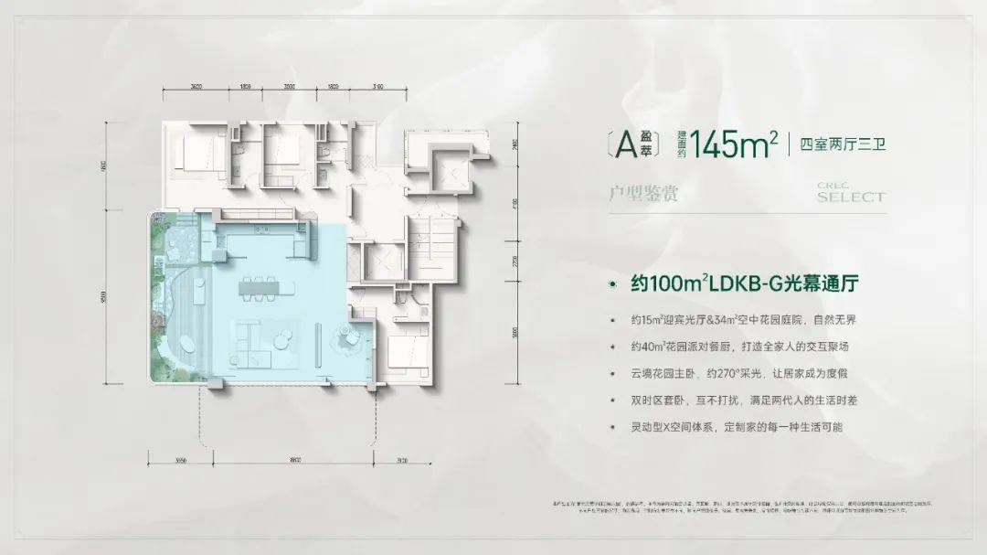 这一点其实在建面约145㎡的户型中,也有体现。该面积段的户型共有3种布局,不同之处在于空中花园阳台分别位于户型的西侧、南侧和北侧。