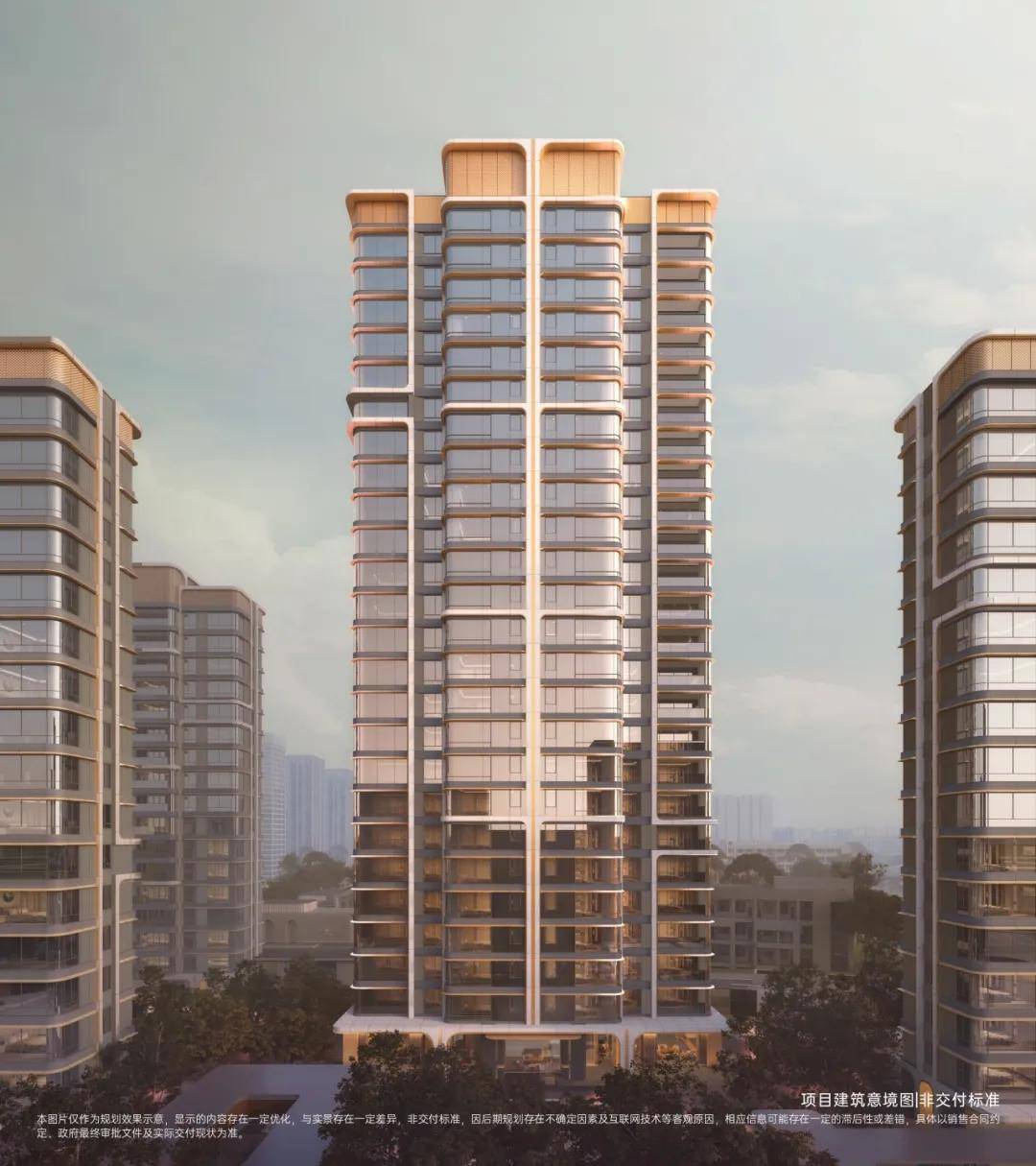 外立面采用全玻璃+铝板幕墙体系,以高级灰和金色进行色彩搭配,外立面都有圆弧玻璃及圆弧铝板设计,用料及造型成本高,增加了外立面的高级感。