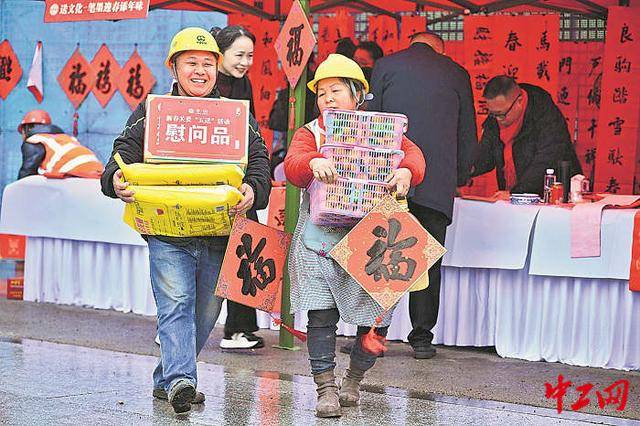 1月30日,四川宜宾三江新区高铁片区保障性租赁住房项目建设工地开展“五送”慰问活动,建筑工人喜气洋洋怀抱新春慰问品。本报记者 李娜 摄