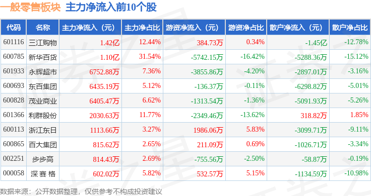 从资金流向上来看,当日一般零售板块主力资金净流出2.23亿元,游资资金净流出630.28万元,散户资金净流入2.29亿元。一般零售板块个股资金流向见下表: