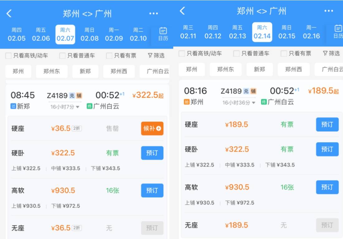 有网友表示,郑州到广州有“反向春运”车票优惠达2折。九派新闻查询发现,郑州到广州的Z4189次列车硬座票价从2月7日起至2月13日打2折,折后价格为36.5元,均已售罄。2月14日,Z4189次列车的硬座恢复189.5元。