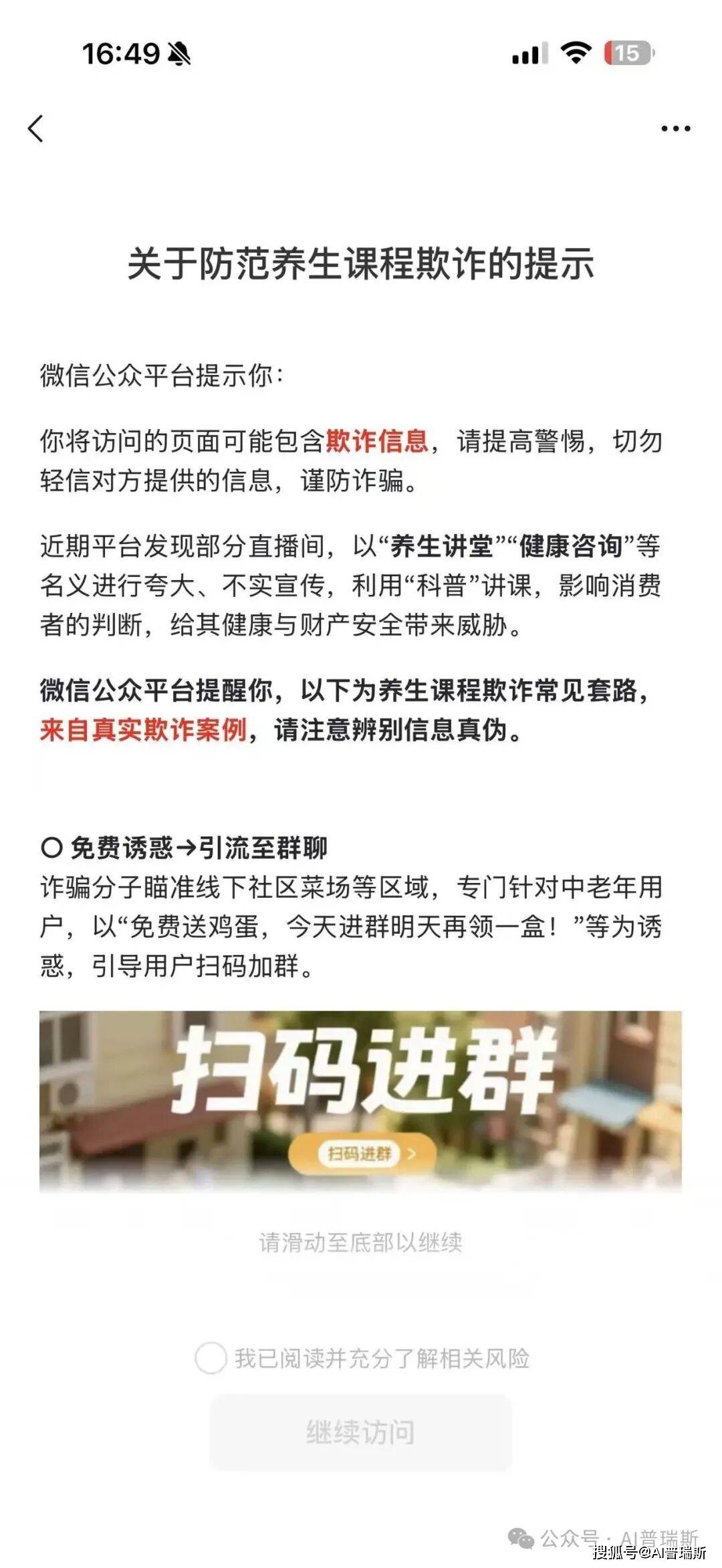 用户选择继续访问后,微信平台会弹出“防范养生课程欺诈提示”。
