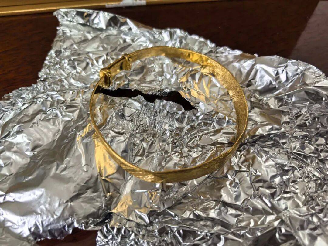 茶叶盒底部确藏有一只用锡箔纸包装的黄金手镯