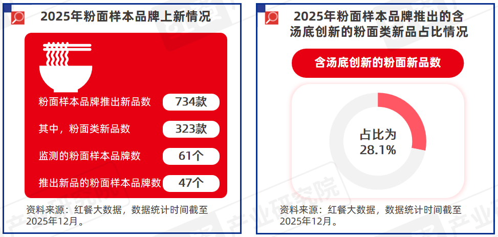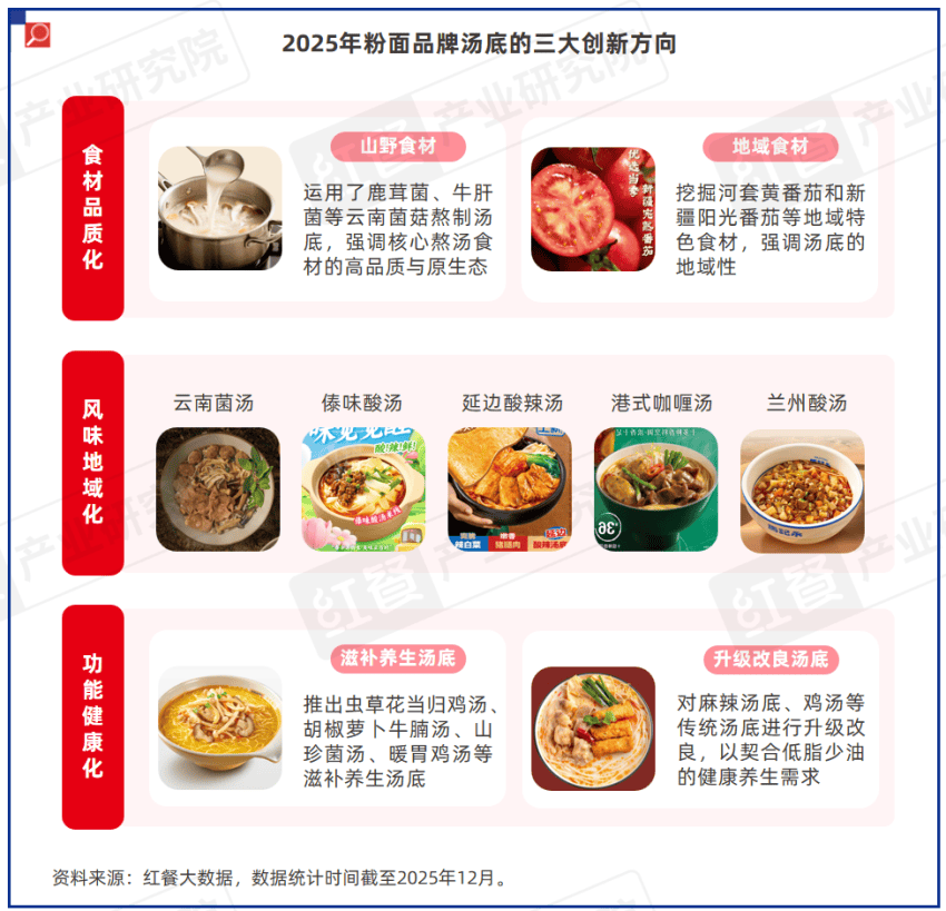 红餐产业研究院监测发现,2025年期间,粉面样本品牌推出的粉面类新品共有323款。通过对这些粉面新品的进一步分析,红餐产业研究院发现这些粉面新品的创新方向主要围绕浇头、汤底、粉面种类等方面展开。其中,汤底作为粉面产品风味的基础,已成为品牌打破同质化竞争的发力点。