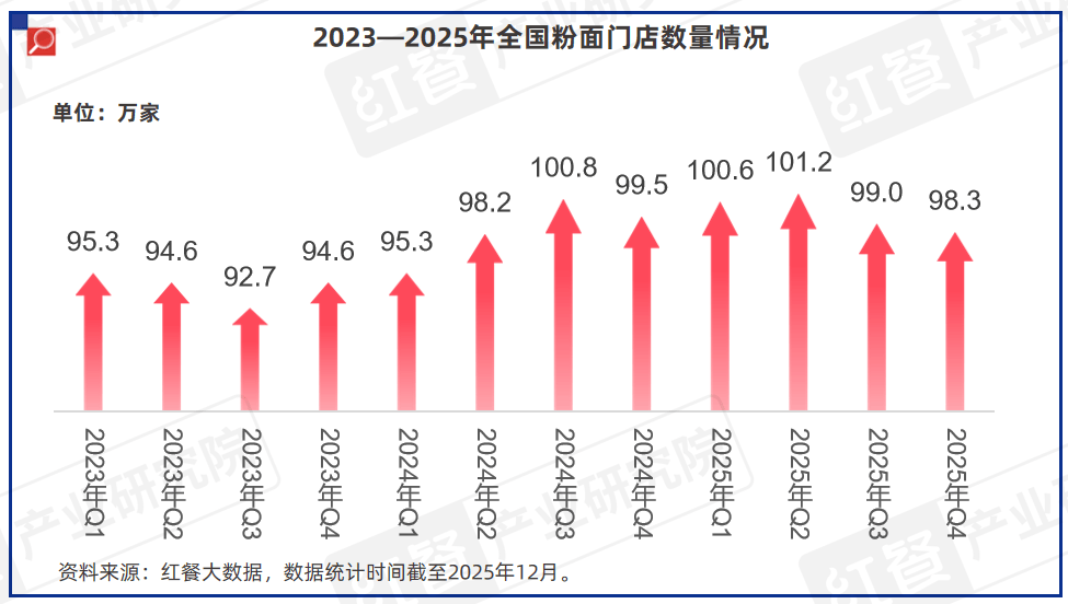 从门店数量来看,2023年至2025年,全国粉面门店数呈波动上涨趋势。红餐大数据显示,截至2025年12月,全国粉面门店数量已超过98万家。