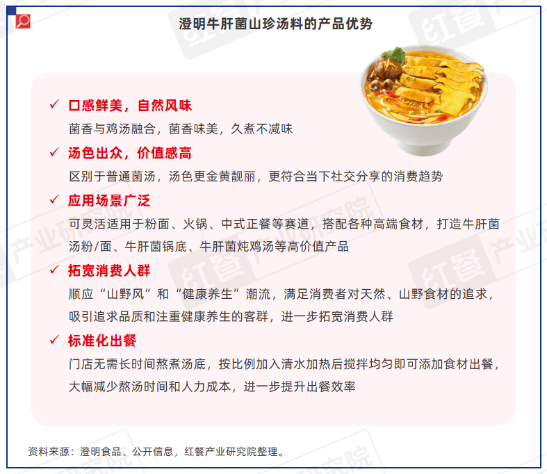 在应用场景方面,澄明牛肝菌山珍汤料可灵活适用于粉面、火锅、中式正餐等赛道,搭配各种高端食材,打造牛肝菌汤粉/面、牛肝菌锅底、牛肝菌炖鸡汤等高价值产品。