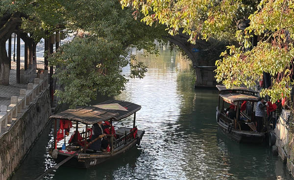 游客乘船在江苏苏州木渎古镇游玩。人民网记者 杜燕飞摄