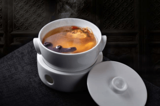 汤品 ・ 山海相融:长白山人参熟成鸡炖红蘑鲟龙筋,甄选长白山道地人参、足时熟成鲜鸡,配伍深山红蘑与珍罕鲟龙筋,文火慢煨数时,参香、鸡鲜、菌韵、鲟筋胶质交融,澄澈汤液尽显滋补本味;