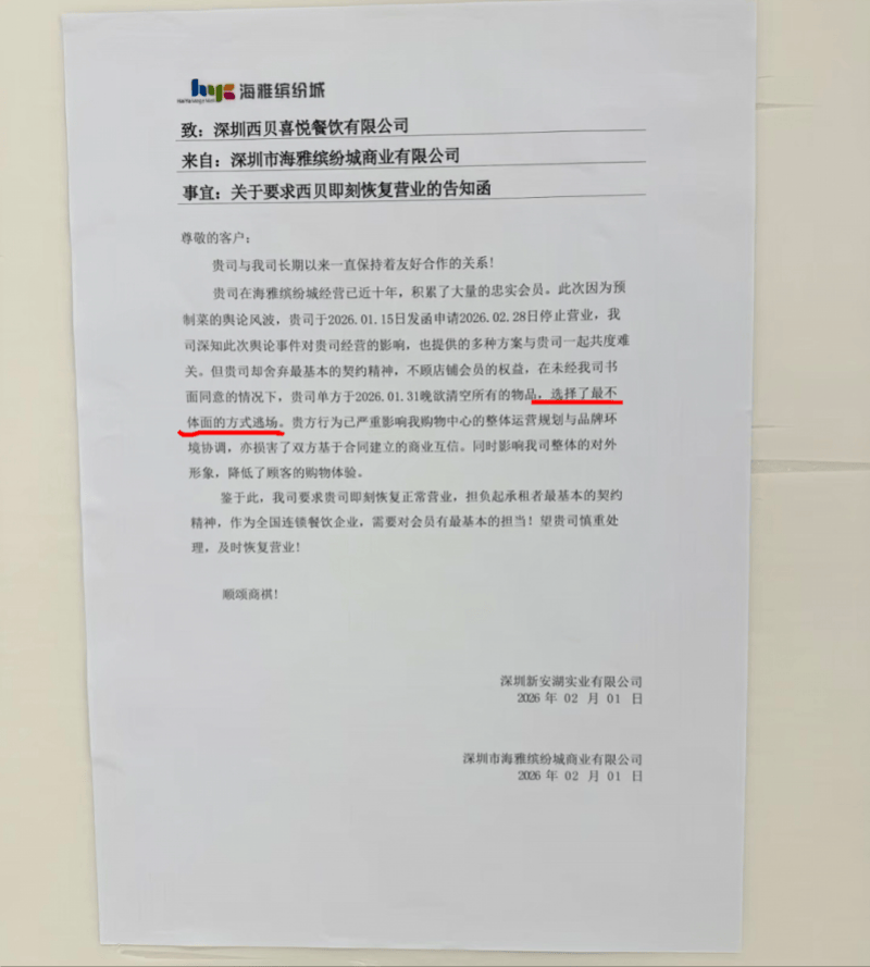 此前曝光于网络的告知函图片显示,该函来自深圳市海雅缤纷城商业有限公司,致深圳西贝喜悦餐饮有限公司。