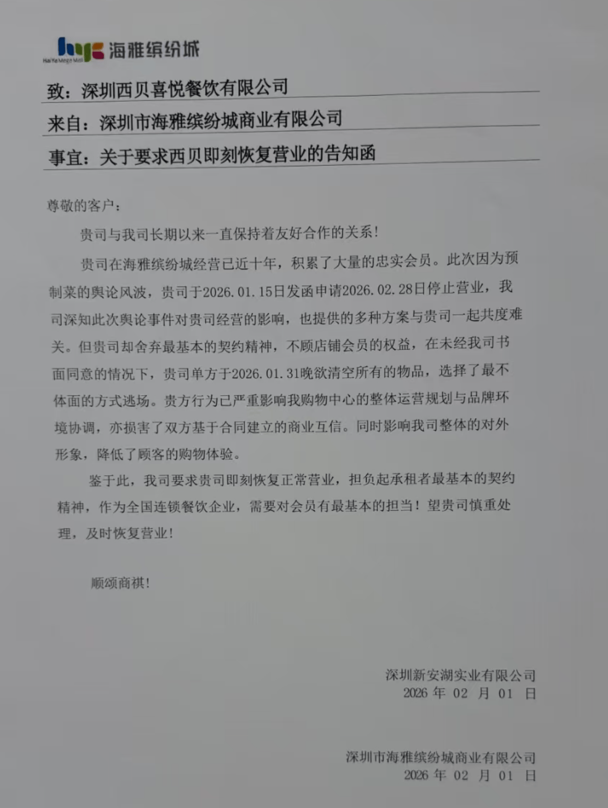 商场方面还认为,西贝的行为严重破坏了购物中心的运营规划与品牌环境,损害了商业互信,要求西贝担负起承租者责任,即刻恢复正常营业。落款显示,该函由深圳市海雅缤纷城商业有限公司与深圳新安湖实业有限公司于2026年2月1日联合发出。