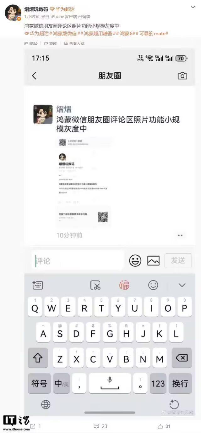 IT之家 2 月 3 日消息,据博主 @熠(yì)熠玩数码今日爆料, 鸿蒙微信朋友圈评论区照片功能小规模灰度中。