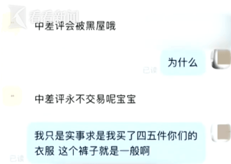 近日,有消费者反映,在电商平台购买79元的牛仔裤并给出“中评”后,被店铺直接拉黑、禁止再次下单。涉事店铺明确表示,“中差评永不交易”,并将此写入主页说明,引发广泛关注。(来源:看看新闻Knews)