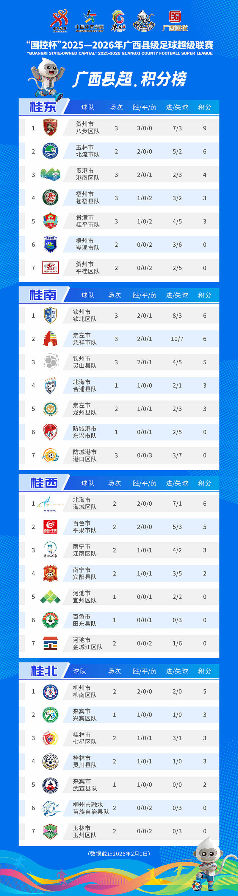 在桂东赛区,贺州市八步区队延续了全胜的强势表现,以3战积9分的成绩稳稳领跑,是赛区内唯一三连胜的队伍。玉林市北流市队同样表现出色,2战全胜积6分紧随其后。贵港市港南区队积分被拉开,而梧州市苍梧县队积分提升至4分,排名上升至第四。