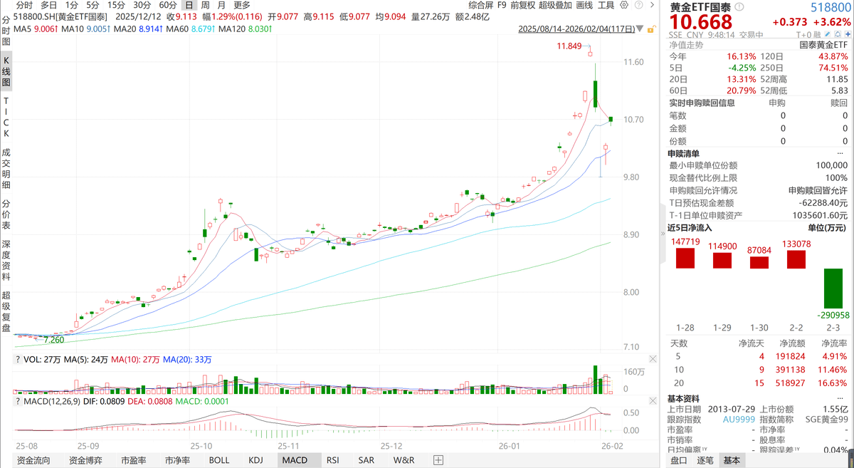 近期黄金市场可谓上演了“过山车”行情,在创下历史新高后经历了大幅回调,国内黄金ETF也未能幸免,一度出现大面积跌停。黄金市场的“冰与火之歌”开启,今日黄金再次反弹,黄金ETF国泰(518800)盘中涨超3.6%。