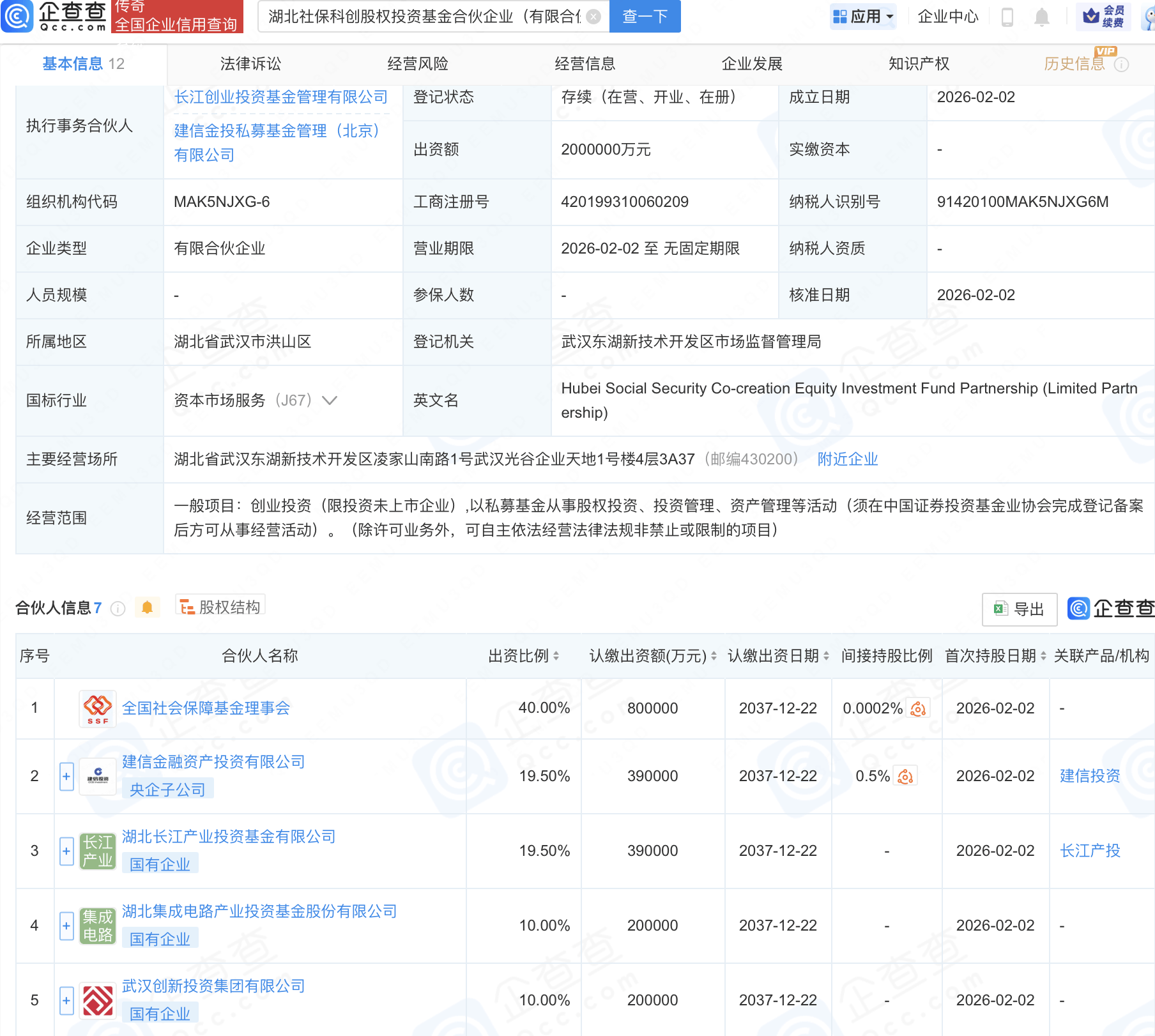 企查查APP显示,近日,湖北社保科创股权投资基金合伙企业(有限合伙)成立,出资额200亿元,经营范围包含:创业投资(限投资未上市企业),以私募基金从事股权投资、投资管理、资产管理等活动。企查查股权穿透显示,该企业由全国社会保障基金理事会、建信金融资产投资有限公司等共同出资。