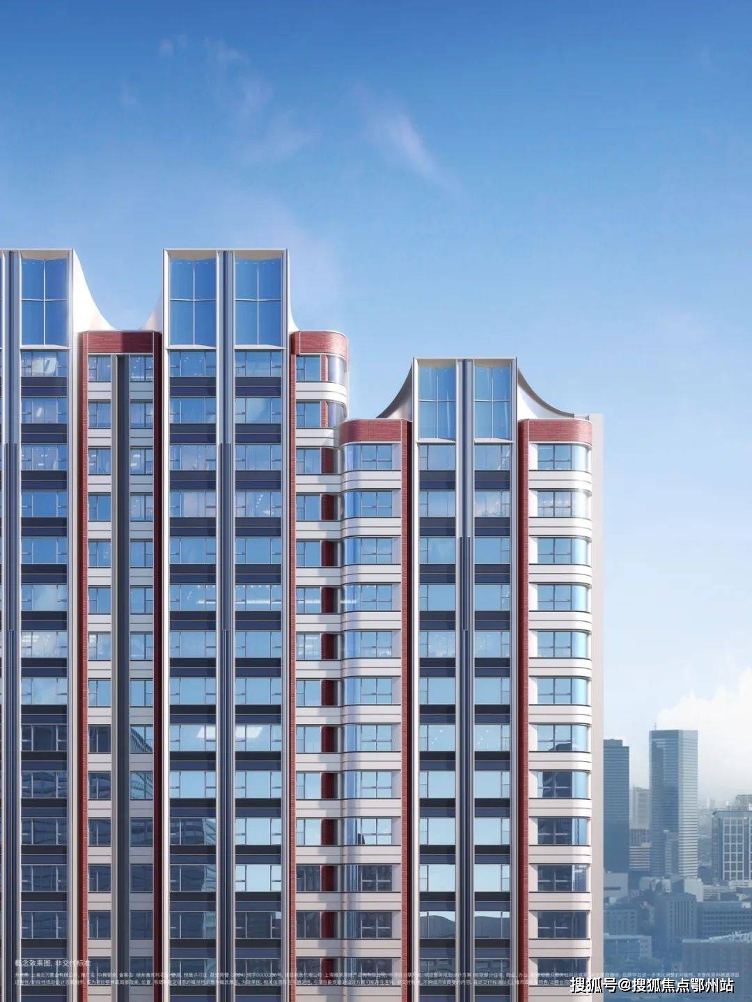 建筑立面色彩以珍珠蓝为核心,搭配香槟金、摩登红。