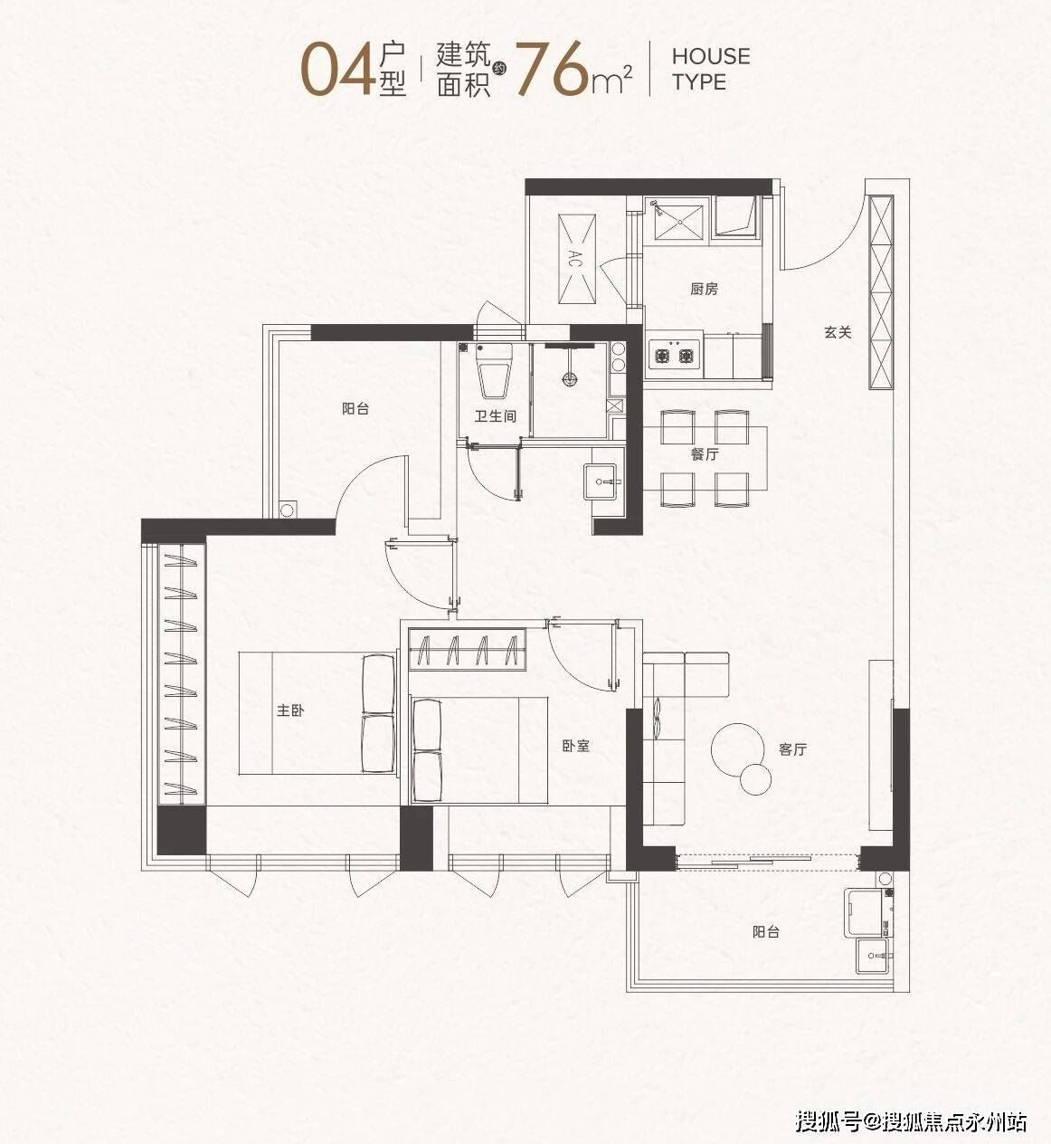 76㎡3房2厅1卫:同样是竖厅格局,LDKB一体化,三开间朝南,阳光和通风效果绝佳,二字型厨房,卫生间三段式干湿分离,避免了早高峰拥挤的问题,得房率约94%,东南朝向,预算有限的三口之家可以重点考虑。