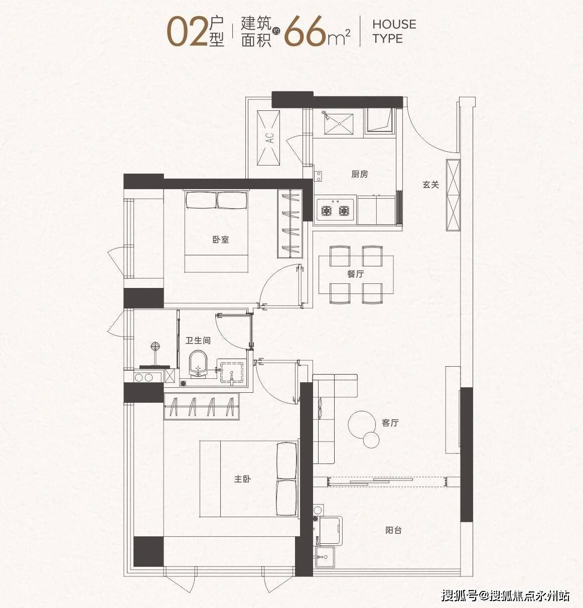 66㎡2房2厅1卫:竖厅格局,LDKB一体化设计,动静分区合理,主卧双飘窗设计,采光和通透感都很好,二字型厨房操作方便,卫生间干湿分离,得房率约93%,西南朝向,适合小两口或者单身刚需居住。