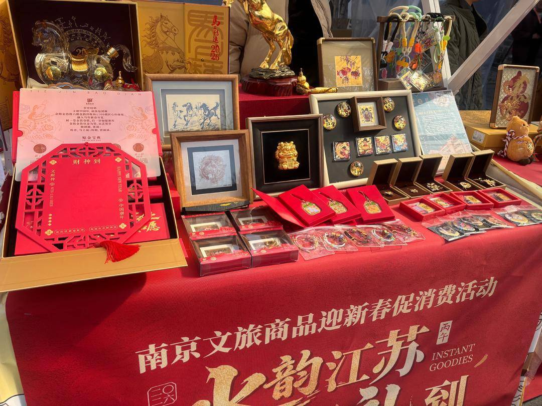 活动期间,老门东街区及南京全市参与活动的文旅品牌店统一张贴活动标识,打造“一店一特色”的马年新春主题氛围。南京云锦研究所、金陵金箔、牛首山、秦淮礼物等众多知名品牌参与其中,涵盖非遗手作、特色食品、文创精品等热门品类。其中,南京云锦研究所推出“龙腾骏业”等马年主题云锦作品,将传统织造技艺与吉祥寓意相融合;金陵金箔则打造“马上如愿”金箔春联礼盒,让非遗技艺以新颖形式走进百姓生活。