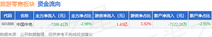 从资金流向上来看,当日旅游零售板块主力资金净流出7200.42万元,游资资金净流入1.43亿元,散户资金净流出7122.28万元。旅游零售板块个股资金流向见下表: