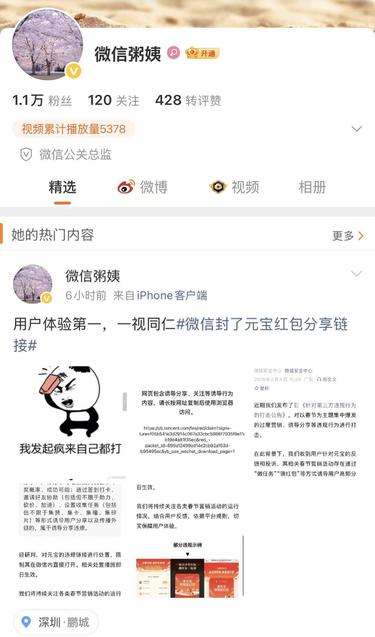 2月4日,微信官方信息第一出口“微信派”公众号发声,以“诱导分享”为由,对同属腾讯旗下的AI助手“元宝”红包链接实施封禁。