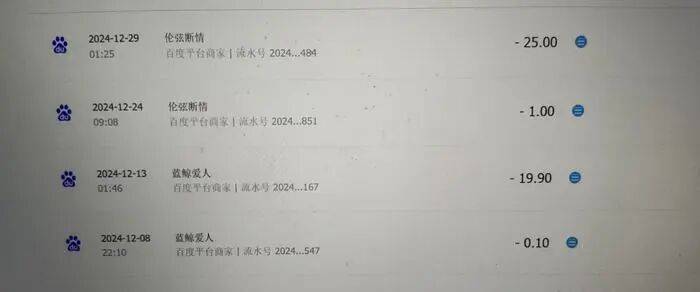 张先生提供的支付记录显示,2024年12月8日,老人在名为“蓝鲸爱人”的百家号博主处支付了0.1元,五天后系统自动扣款19.9元;12月24日,在另一名博主“伦弦断情”处支付1元,五天后又自动续费25元。 此后,系统持续自动扣款,累计金额达540元。
