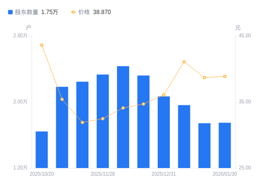 日期A股户数(户)流通A股户均持股数(股)户均持股市值(万元)2026-01-301748180349.69312.322026-01-201743380570.93311.812026-01-091961871597.15294.192025-12-312067767930.21245.022025-12-192320360534.97210.002025-12-102434157704.82196.772025-11-282332560218.35195.532025-11-202246162534.75199.492025-10-312183457116.08202.192025-10-201643275892.92330.97
