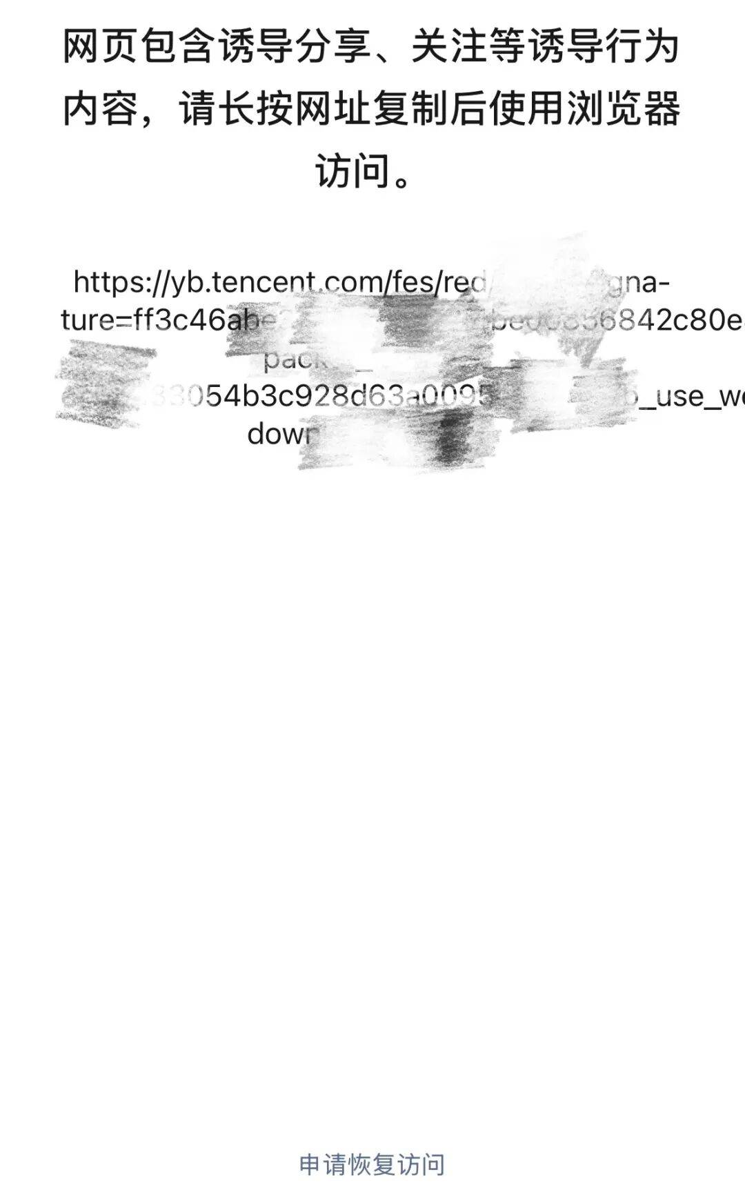 现在微信中打开他人分享的元宝红包链接,不再是提醒下载或直接弹窗领取红包,而是变成了文字链接,需要二次复制链接到浏览器自行打开。
