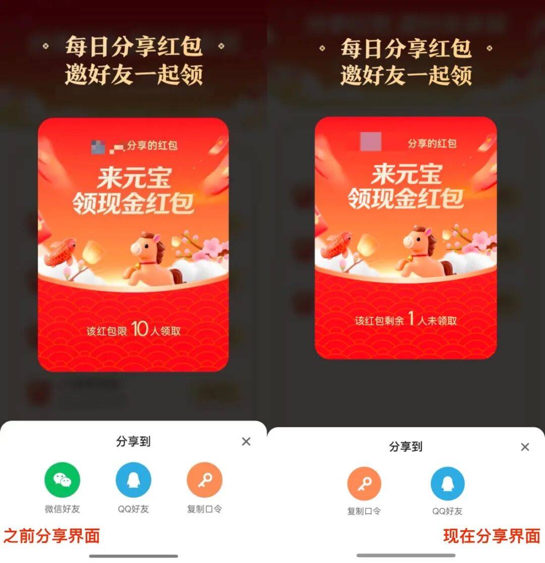 随后我们也看到元宝App中分享红包邀请好友领取界面变成了只剩下“复制口令”和“QQ好友”两个选项。不知道这波大家如何评价?