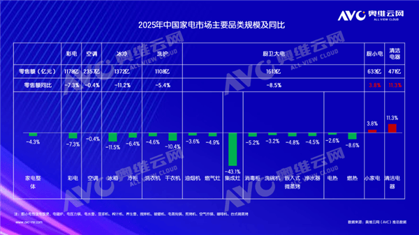 快科技2月4日消息,2025年,中国家电市场整体承压,奥维云网数据显示,不含3C的家电市场零售规模8931亿元,同比下滑4.3%。